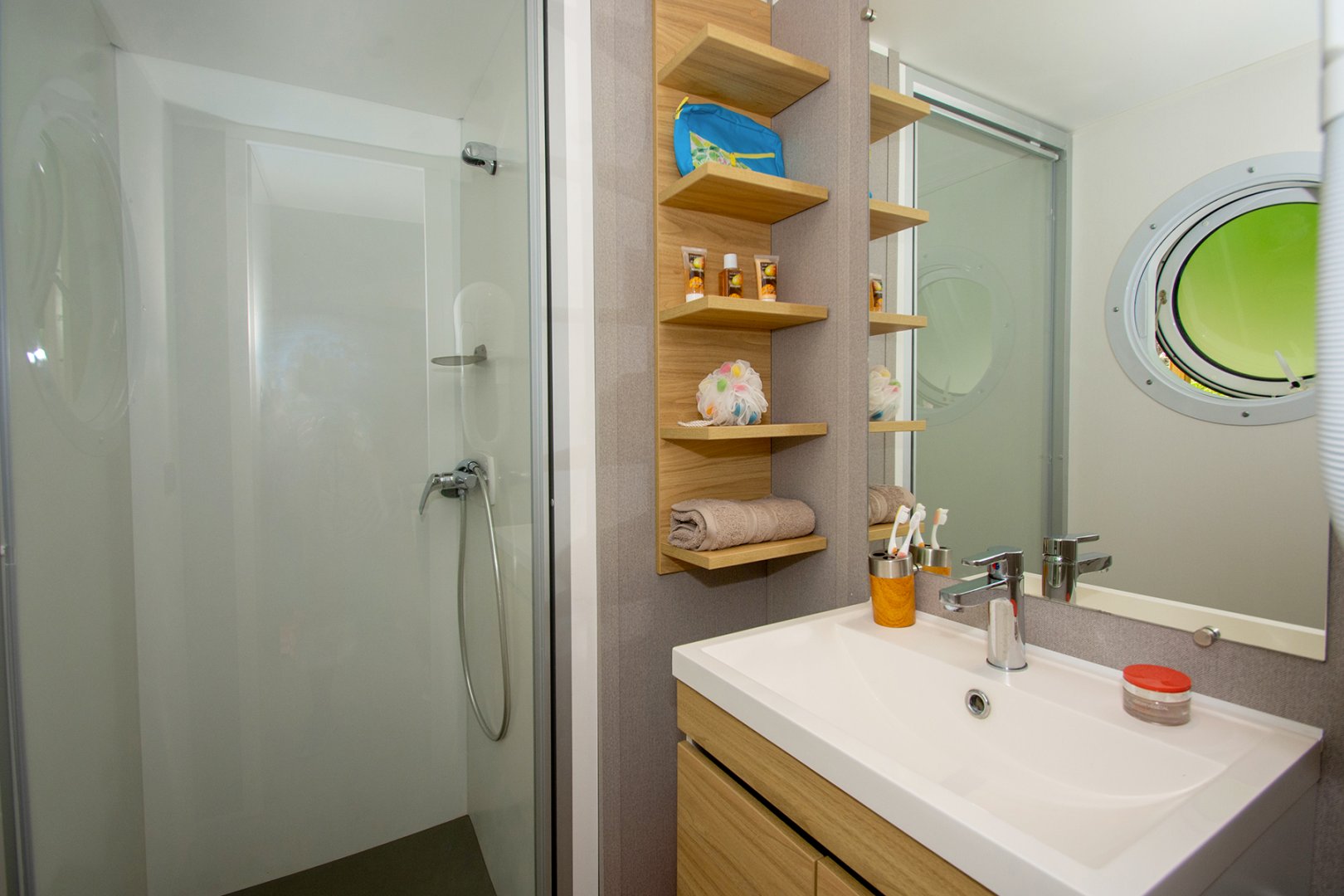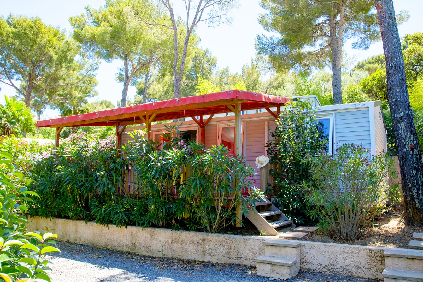 Covered wooden deck with garden furniture (dining table + garden chairs)
