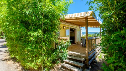 Covered wooden deck with garden furniture (dining table + garden chairs)